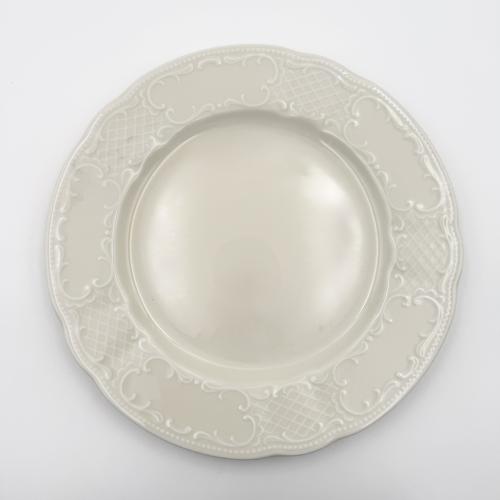 Cette grande assiette de présentation de 30,5 cm, de couleur beige, se distingue par ses moulures sur les bords. Parfaite pour sublimer vos repas, mariages ou événements, elle ajoute une touche d'élégance et de raffinement à votre table.