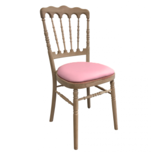 Découvrez la chaise Napoléon bois brut avec galette rose, un incontournable du mobilier de réception disponible à la location. Ce siège élégant est idéal pour accueillir vos convives lors de vos plus belles réceptions en Alsace. Empilable et confortable, il convient aussi bien aux mariages, banquets ou dîners de gala, en intérieur comme en extérieur.