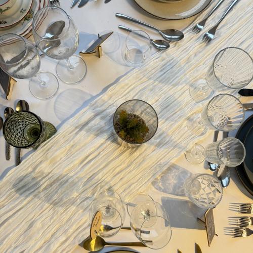 chemin de table gaze, gaze de coton blanc, chemin de table blanc, décoration table mariage, chemin de table boho, déco bohème, décoration champêtre, chemin de table en tissu, chemin de table gaufré, mousseline blanche, location chemin de table Alsace