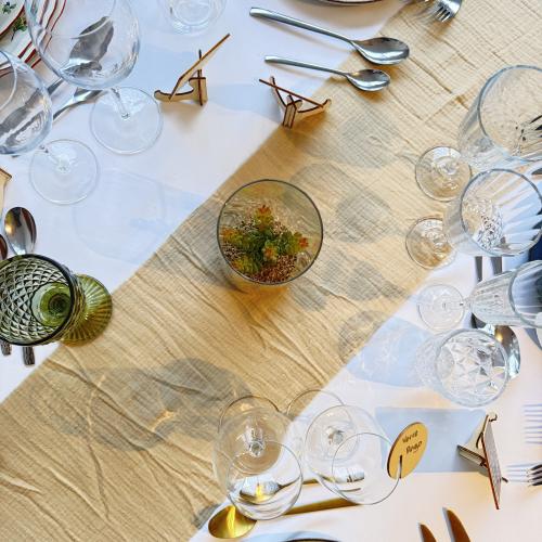chemin de table beige, coton gaufré, déco table mariage, chemin de table champêtre, décoration bohème, chemin de table naturel, linge de table beige, déco boho chic, chemin de table long, décoration événementielle Alsace