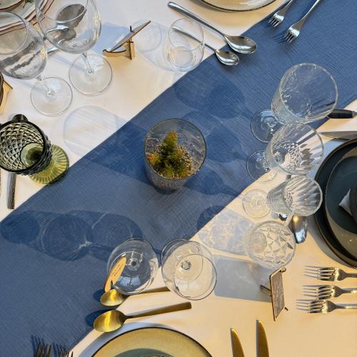 chemin de table bleu, chemin de table coton gaufré bleu, chemin de table bleu denim mariage, décoration table bleu, chemin de table bohème bleu, linge de table bleu, chemin de table gaufré 3 mètres, décoration événement bleu, location décoration mariage Alsace.