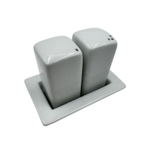 Ensemble salière / poivrière en céramique blanche, présenté sur un support assorti pour une présentation soignée. Parfait pour un mariage, une réception, un repas d’entreprise, un banquet ou tout événement nécessitant une table harmonieuse et bien équipée.