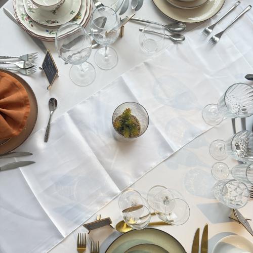 chemin de table satin blanc • déco table mariage blanc • chemin de table élégant • chemin de table chic • décoration satin blanc • location décoration mariage Alsace • chemin de table événementiel
