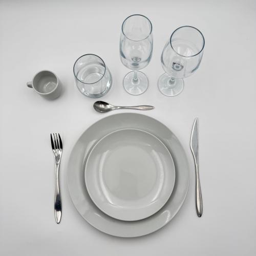 Notre Formule Événement Simple qui allie simplicité et élégance grâce à son assortiment d’assiettes Intemporelles rondes et de couverts Comas.